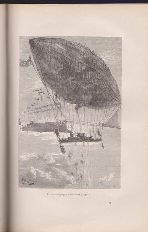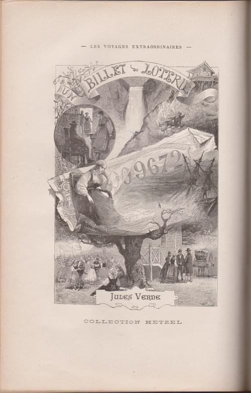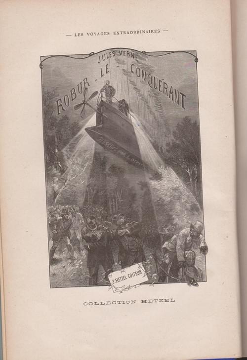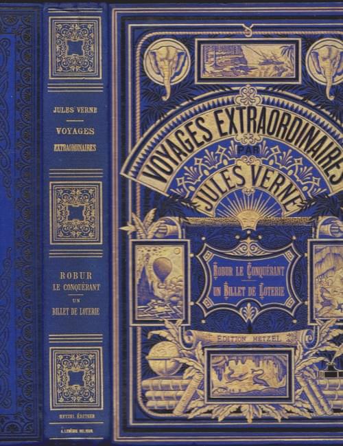 "AUX DEUX ELEPHANTS". Bien daté 1886 pour les deux titres. Première édition collective illustrée : grand in-8. Premier cartonnage collectif "Edition Hetzel" de type Lenègre, sur le deuxième plat macaron central J.V/J.H sur fond noir, frise dans les coins. Volume double de 446 pages. Jules Verne avec" Robur" personnage aussi fort que Nemo passe de la montgolfière au "plus lourd que l'air" en plein développement d'ailleurs un inventeur allemand avait déposé un brevet en 1884 pour un véhicule aérien à hélices contrarotatives. 230 pages illustrées de 45 dessins par Benett." Un billet de loterie" part une nouvelle fois d'un naufrage . Jolie bleuette. Une page double blanche. 190 pages illustrées par George Roux, une carte du sud de la Norvège. Catalogue DF de douze pages pour les nouveautés 1886-87. (et non pas quatre du Jauzac). De la page 187 à 198 "FRRITT- FLACC" nouvelle fantastique illustrée par G Roux. Table des matières pour les deux derniers titres sans mention de chapitre. Splendide exemplaire, sans défaut dans un très beau bleu, toile légèrement granitée. Intérieur blanc.